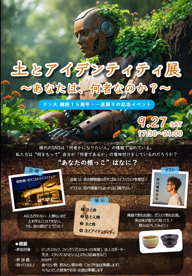 で、今年の福岡テンジン大学の15周年は、ふと「自然の土と人間のアイデンティティについて、深掘りするような展示会×交流会をしたいなー」と思い、約1カ月間のAIと相当な文量のやりとりを重ねて、展示会の展示物(パネル)の制作も、ほぼ一人でやってしまいました。